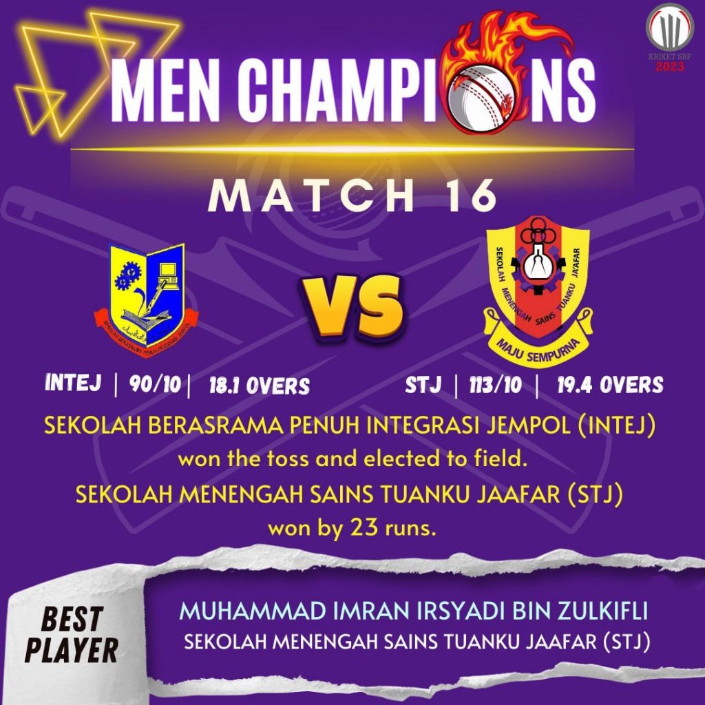 Pasukan Kriket SMSTJ terlibat dengan Kejohanan Kriket SBP Zon Selatan 2023 bertempat di SBPI Jempol. Pasukan Kriket SMSTJ akan berlawan dengan Pasukan Kriket SMAP Labu pada hari ini pada jam 2.00 petang. Didoakan semoga pasukan SMSTJ akan memperoleh kejayaan dan seterusnya melayakkan diri ke pusingan akhir peringkat kebangsaan.